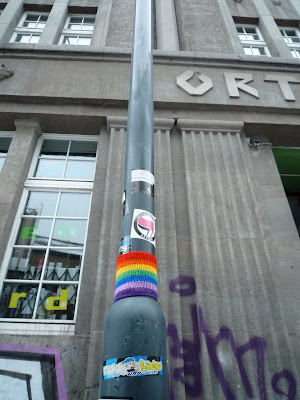 The deed is done! My first foray into yarn bombing is complete. My accomplice took photos of the Strickbombe at work and not one of the passers-by said a word. To start with, I was shaking a bit because of the nerves, later I was shivering because of the cold. Not my best seaming ever, I really need to work on my lettering and the bumble bee was far too wide, although I am quite pleased with the crocheted wings. So let's see how long the first assault lasts, which would, of course, mean that someone would have to actually notice the wool first. Anyway, I have lots of ideas for more.Die Strickbombe hat zugeschlagen! Mein erster Streifzug wurde von meinem Komplizen fotografisch festgehalten während ich grossenteils von Passanten ignoriert wurde. Ich habe ein wenig gezittert - zuerst wegen Nerven, dann wegen der Kälte. Ich hab' schon schönere Nähte gesehen, ich muss an meiner mehrfarbigen Techniken arbeiten und die Biene war viel zu breit, aber die gehäckelten Flügel sind ganz niedlich. Naja, mal schauen, wie lange die Bomben da bleiben. Was natürlich voraussetzt, dass die jemanden überhaupt auffallen.... Auf jeden Fall habe ich ganz viele Ideen für weitere wollige Anschläge.